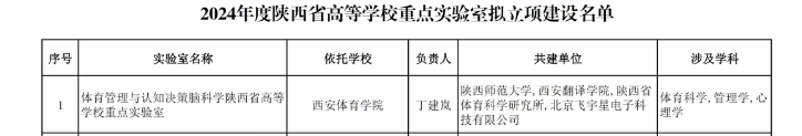 我院体育管理与认知决策脑科学陕西省高等学校重点实验室申报工作圆满完成,正式获批成立。该实验室依托万象城allwincity官网体育经济与管理学院,联合万象城allwincity官网运动人体科学学院、陕西师范大学体育学院、西安翻译学院、陕西省体育科学研究所及北京飞宇星电子科技有限公司共建,标志着陕西省在体育管理与认知决策脑科学领域的研究迈入了新阶段。