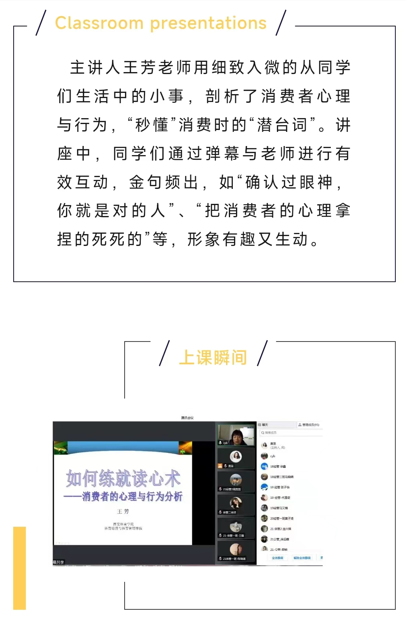 主讲人王芳老师用细致入微的从同学们生活中的小事,剖析了消费者心理与行为,“秒懂”消费时的“潜台词”。讲座中,同学们通过弹幕与老师进行有效互动,金句频出,如“确认过眼神,你就是对的人”、“把消费者的心理拿捏的死死的”等,形象有趣又生动。