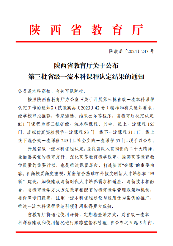 2024年3月5日,陕西省教育厅发布了《关于公布第三批省级一流本科课程认定结果的通知》(陕教高办〔2023〕42号),其中,我院教师于美至老师所主持的《体育市场营销学》课程脱颖而出,成功获批为省级一流本科课程,成为该学院课程建设的又一重要里程碑。