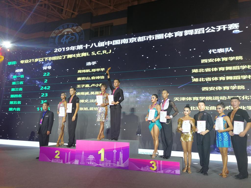 我院共有四对选手参加本次比赛,经过两天激烈角逐,我院代表队共获得了3项冠军,1项亚军,1项第四名,1项第五名的优异成绩。其中周炜航、郑芊芊(专业21岁以下B组拉丁舞 冠军,专业21岁以下A组拉丁舞第五名);凌雨威、吴嘉玲(大学生A组拉丁舞 冠军,专业21岁以下B组拉丁舞 第四名);刘子奇,王瑞娇(成人A组标准舞 冠军);刘锦政、王梓源(成人A组拉丁舞 第二名)。
