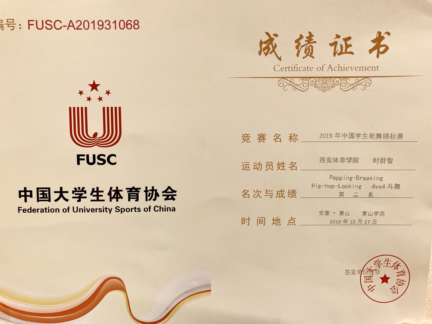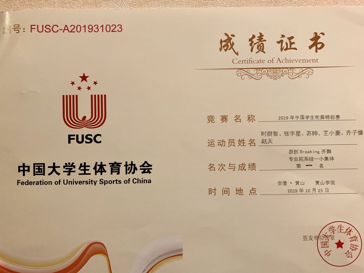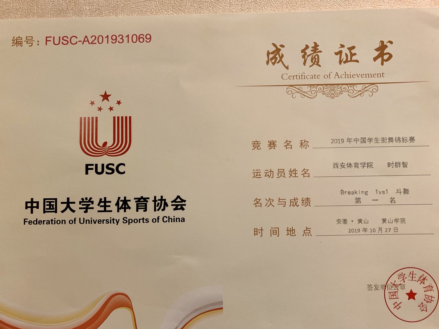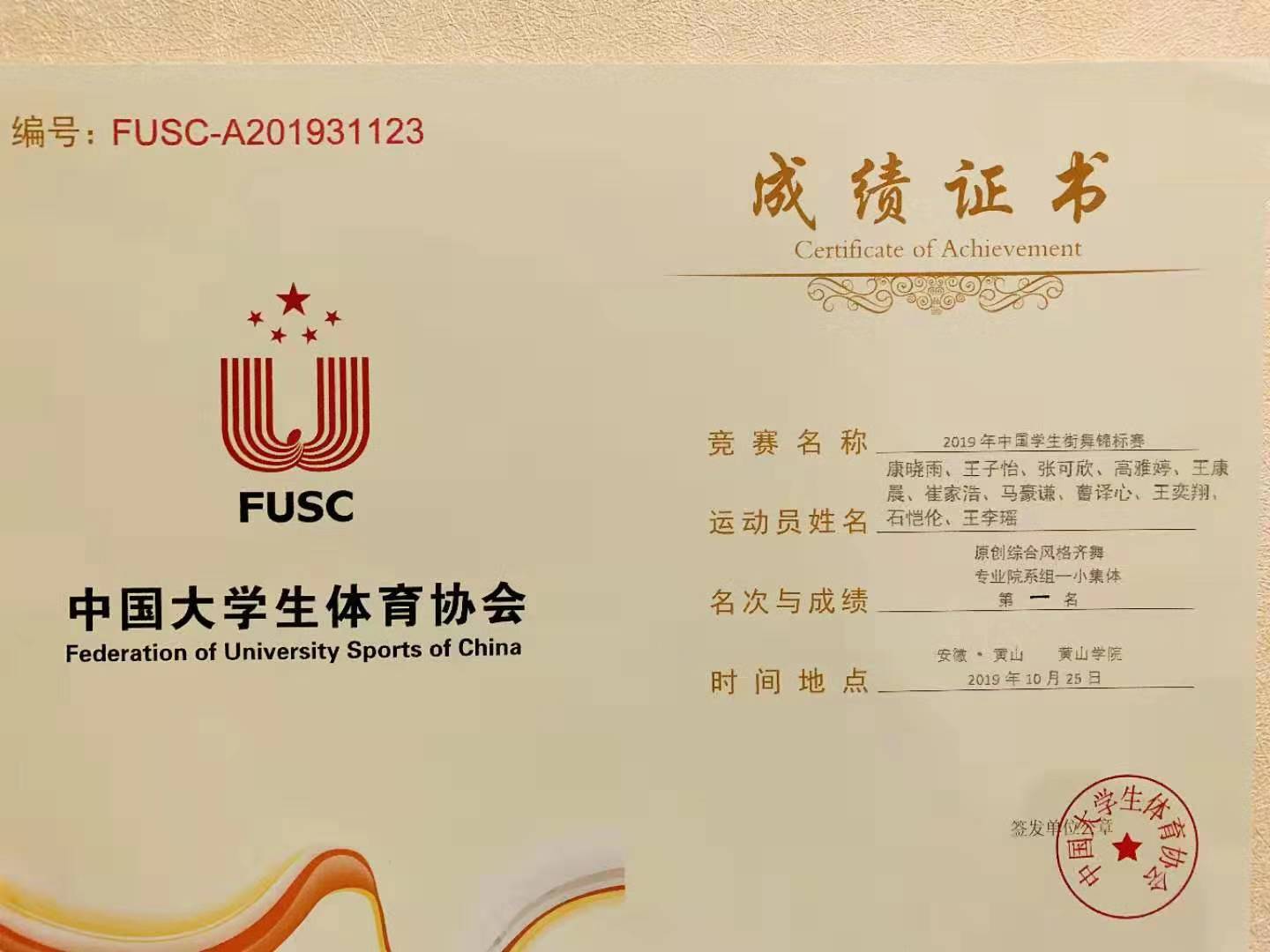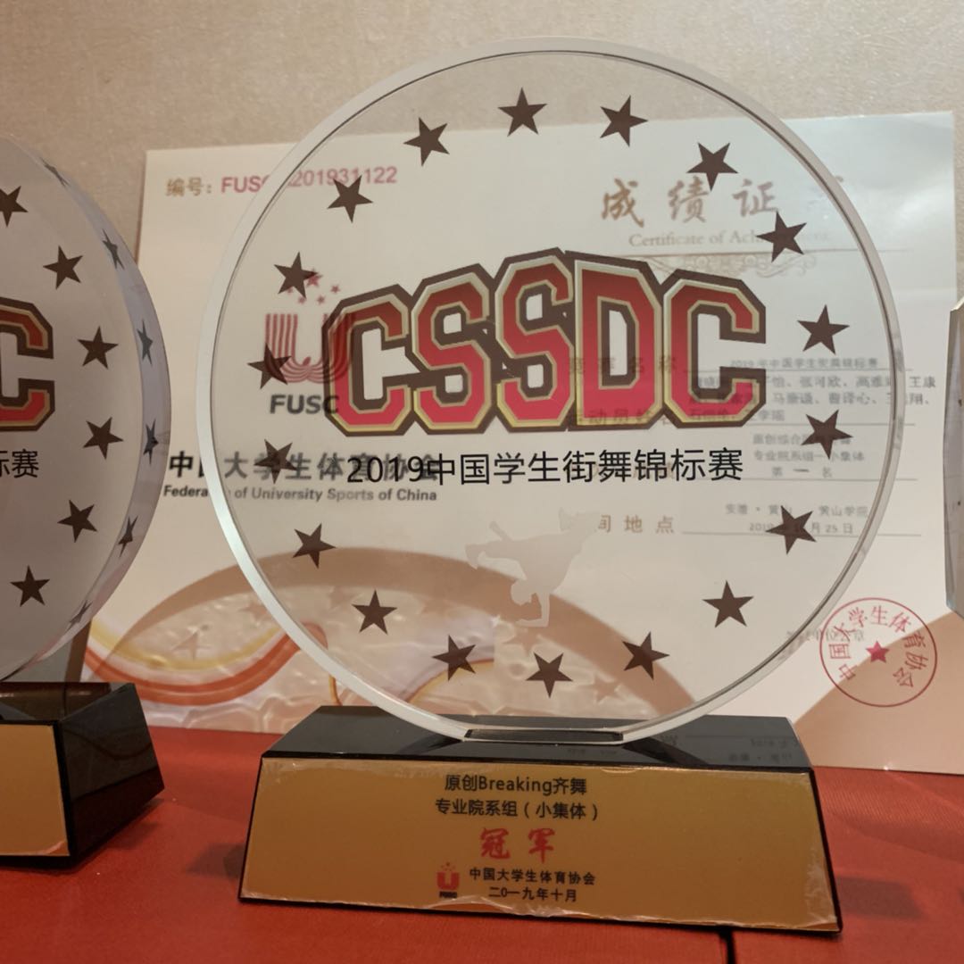 10月28日晚,2019年中国学生街舞锦标赛闭幕式暨颁奖晚会在黄山学院体育馆隆重举行,圆满落幕。在此次大赛中,万象城allwincity官网李文强带领我院17名学生齐心协力、争创佳绩,喜获原创齐舞冠军、Breaking齐舞冠军、我院17级时群致获得1V1Breakingbattle冠军、4V4亚军。除此之外本次比赛李文强教师获得优秀教练员奖,队员时群致获得最佳人气奖,团体最佳创意奖、最佳编舞奖、最佳表演奖。张敏老师承担本次比赛裁判工作。