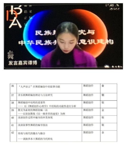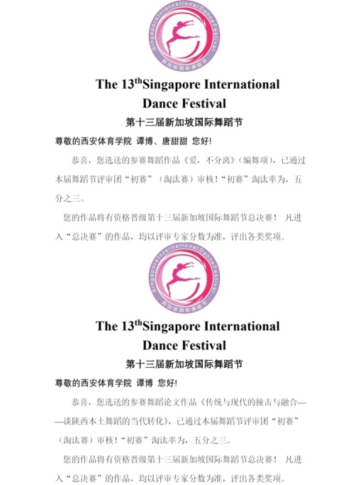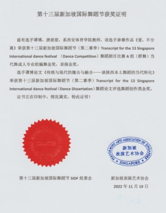 谭博老师的论文《传统与现代的撞击与融合——谈陕西本土舞蹈的当代转化》同时获得了第十三届新加坡国际舞蹈节(第二赛季)论文评奖金奖。该论文于2022年11月2被北京舞蹈学院BDA舞蹈论坛采用并邀请谭博作为发言嘉宾在分论坛民族舞蹈研究与中华民族共同体意识建构发言,充分展示了我院教师的科研成果。