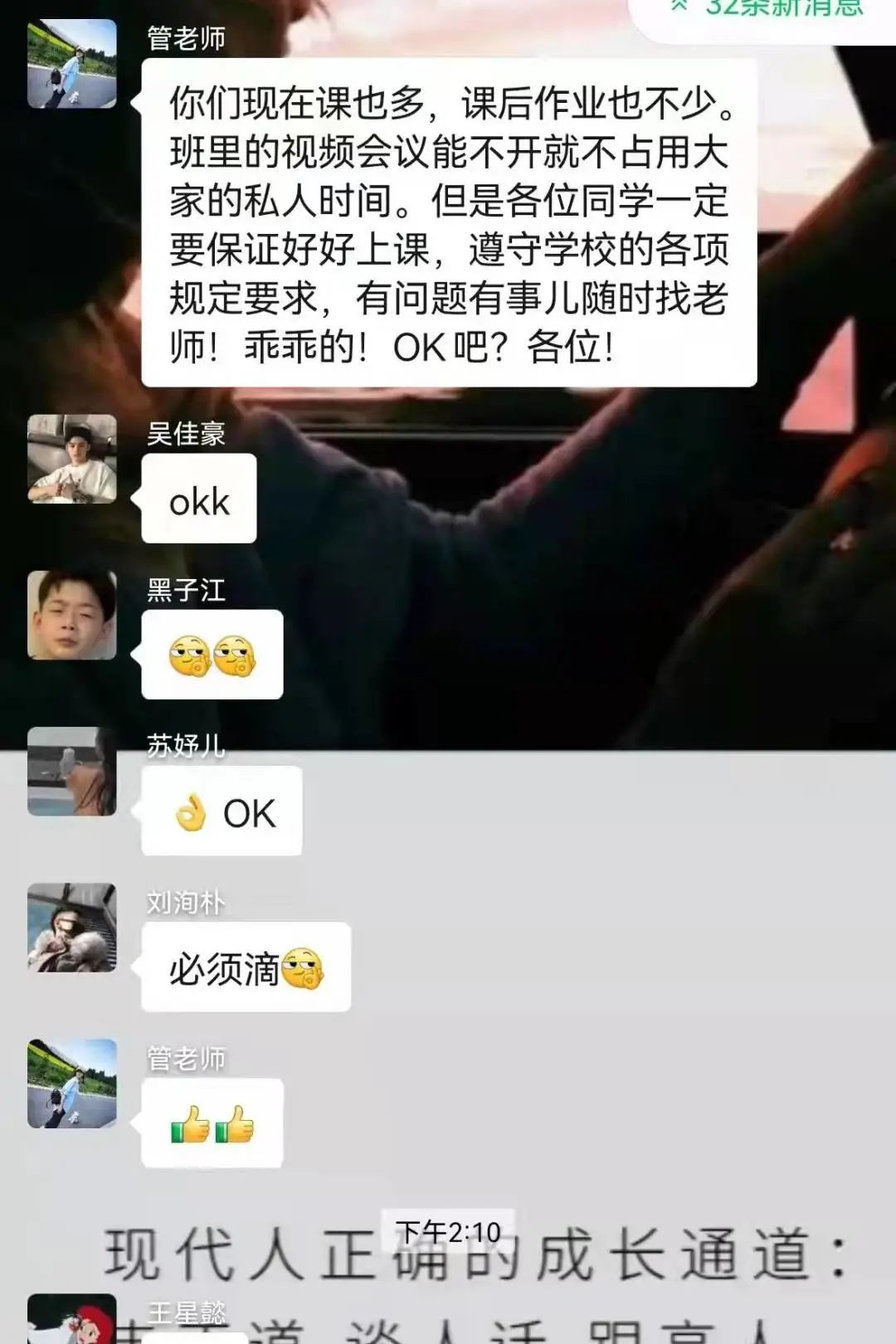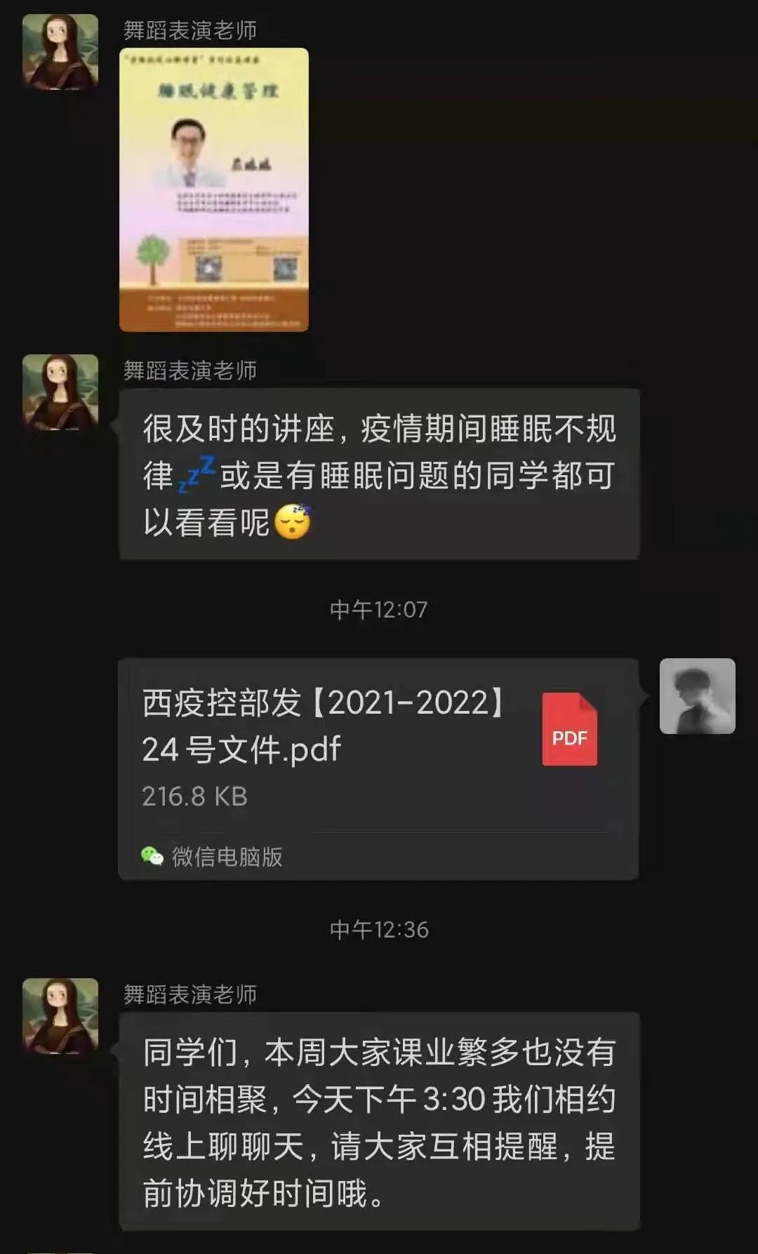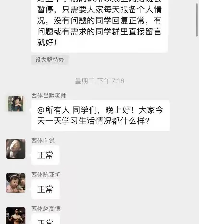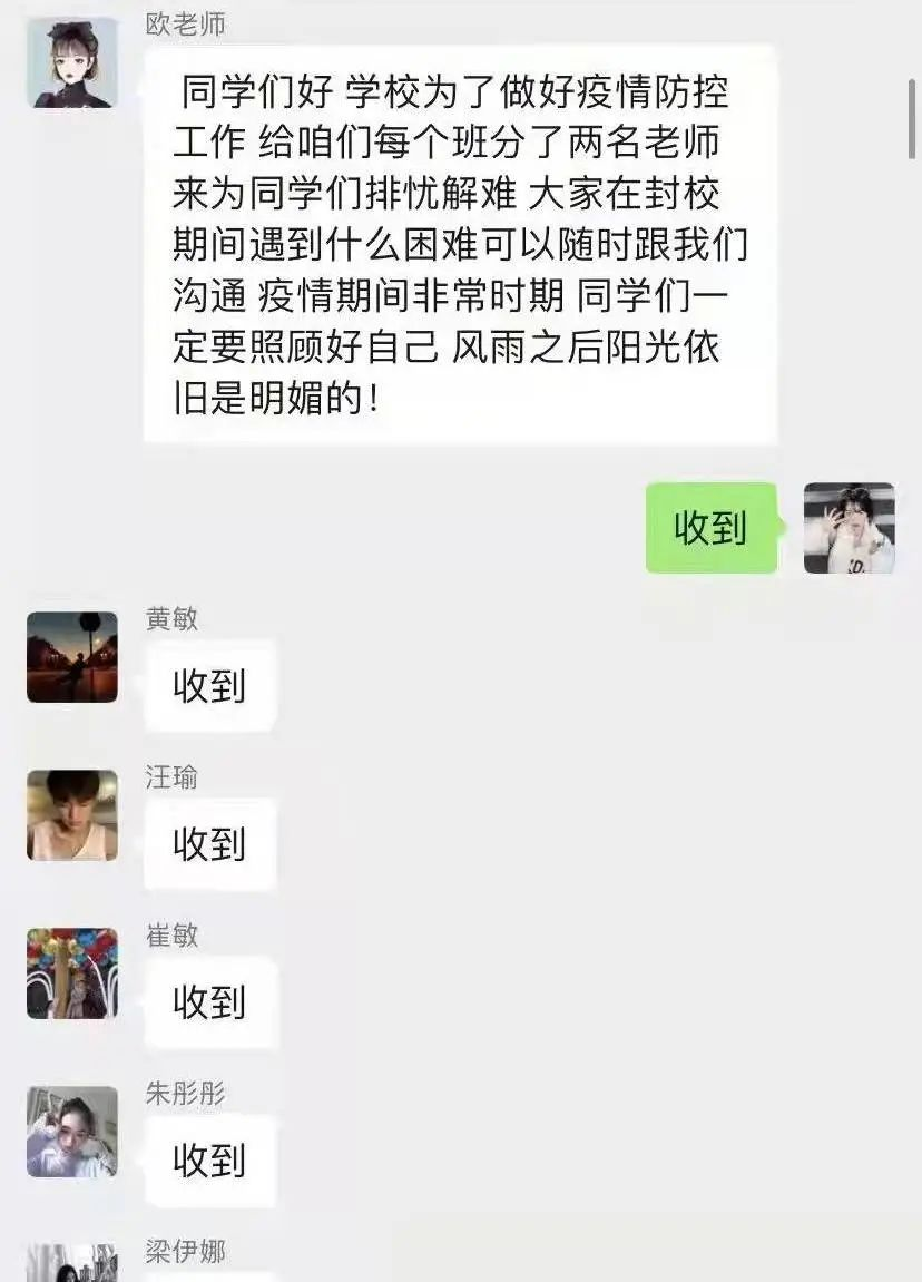 加入班级后,各班班主任利用线上平台,以视频和语音等方式与学生积极联系,深入给予学生普及防疫知识,了解学习状态、解决生活困难、掌握思想动态,积极开展线上活动,消除学生恐慌、疑虑的情绪。在万象城开展的疫情防控“思政大课”活动期间,积极督促学生进行思政大课学习,引导学生弘扬伟大抗疫精神,以实际行动做好疫情防控“思政大课”。
