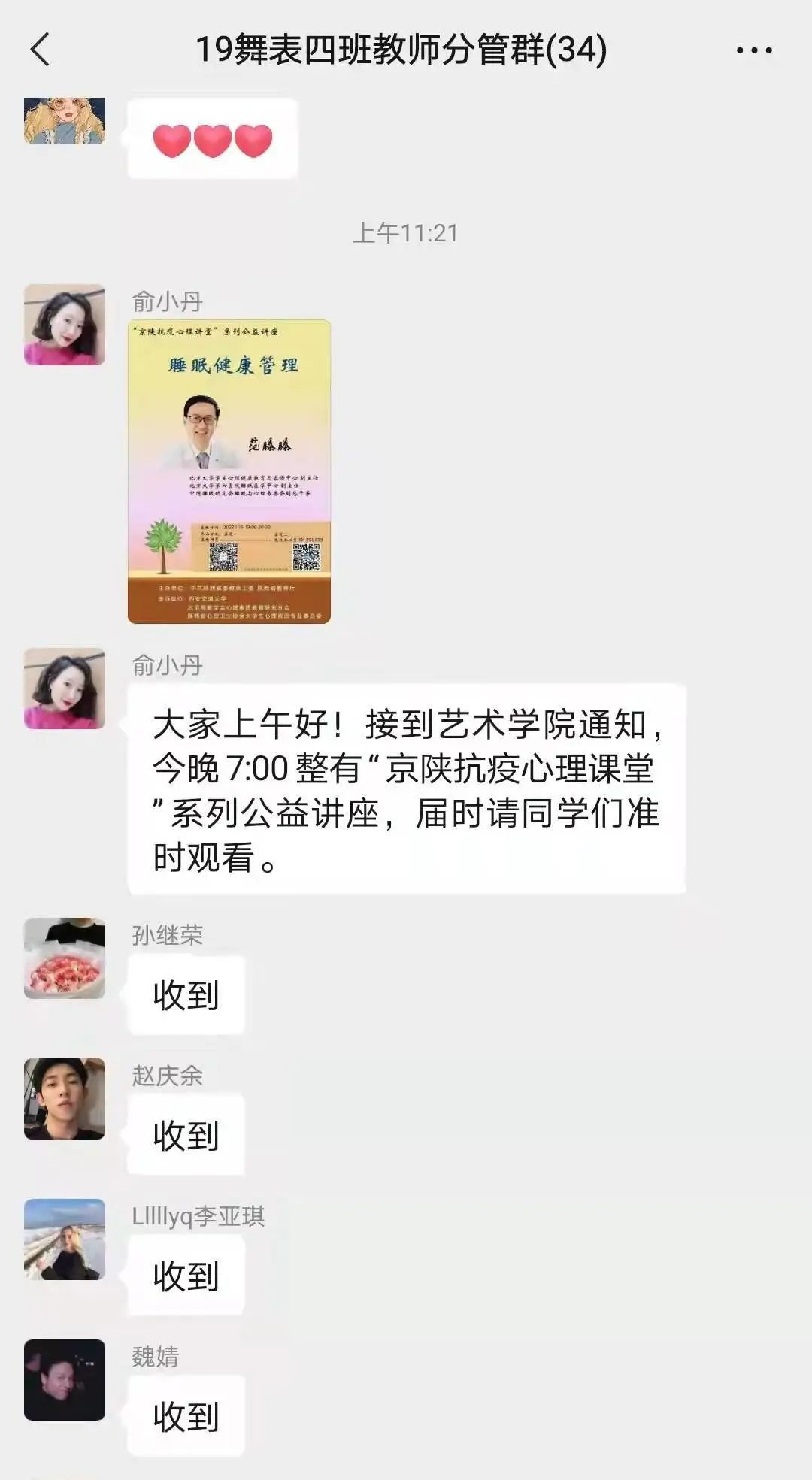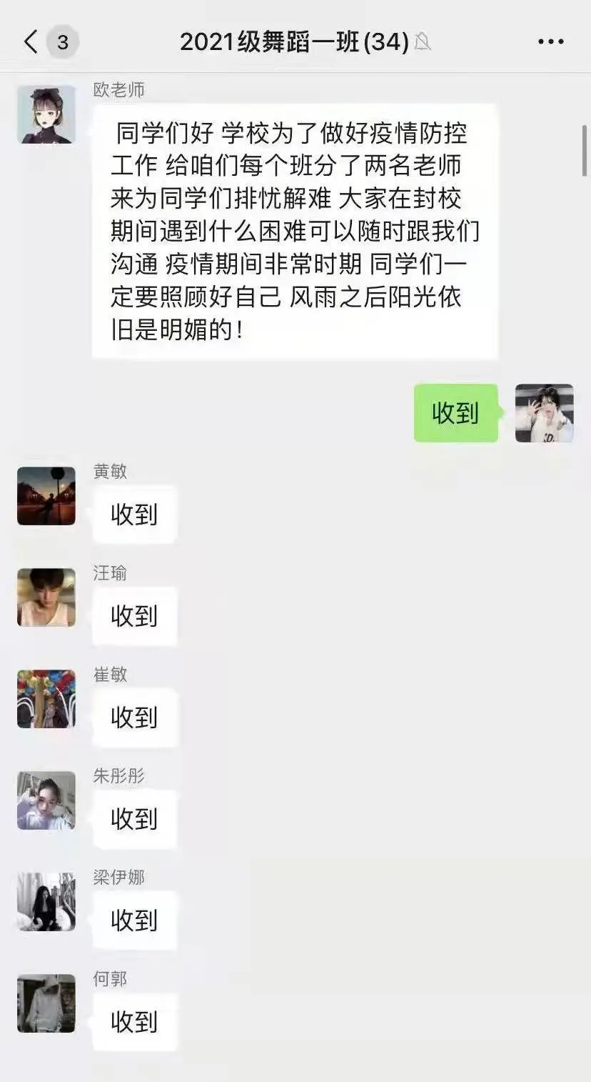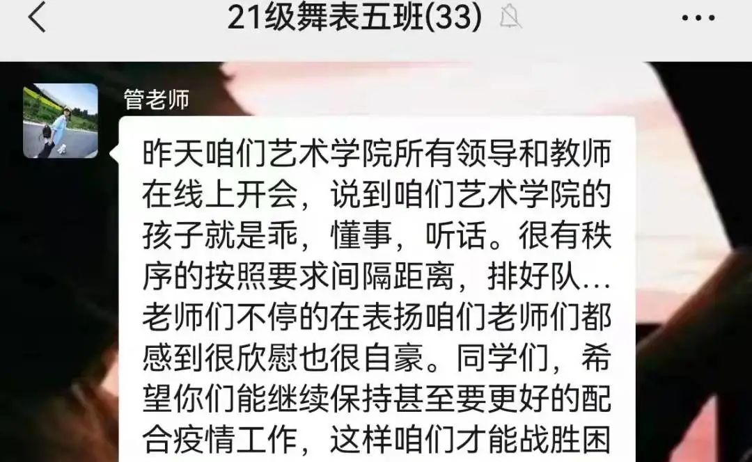 为做好疫情防控期间学生思想教育管理工作,根据万象城疫情防控工作指挥部下发的《关于加强疫情防控期间专任教师承担本科学生班主任和领导干部、研究生导师、教练员联系学生(运动员)工作的通知》,艺术学院开展相关工作,联系领导干部、专任教师进行对接,各班班主任的配备,班主任及时加入各班班群并开展工作。