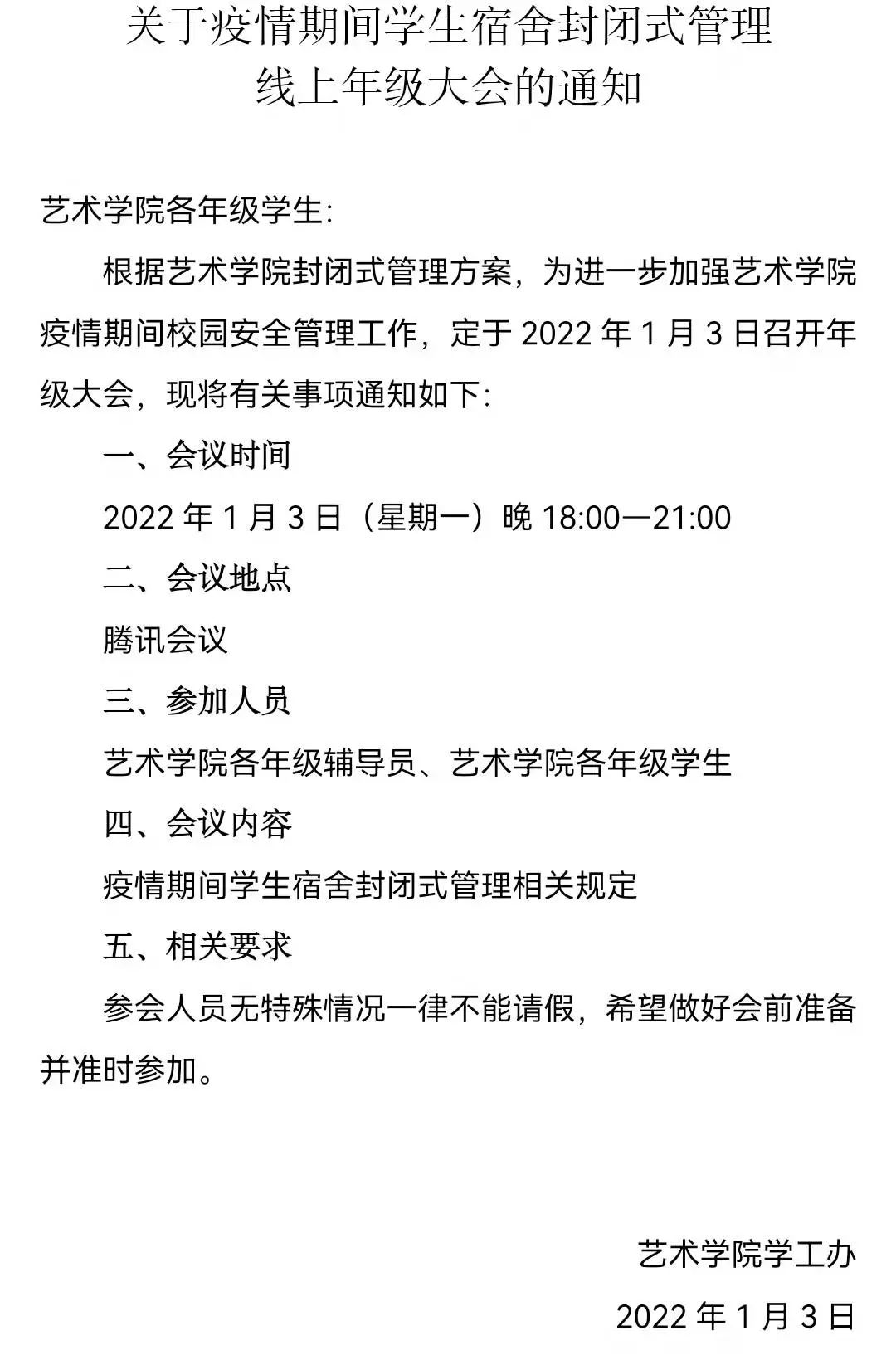 为全力做好艺术学院学生疫情防控工作,加强疫情期间学生宿舍封闭式管理工作,2022年1月3日晚,艺术学院各年级辅导员召开各年级线上大会。