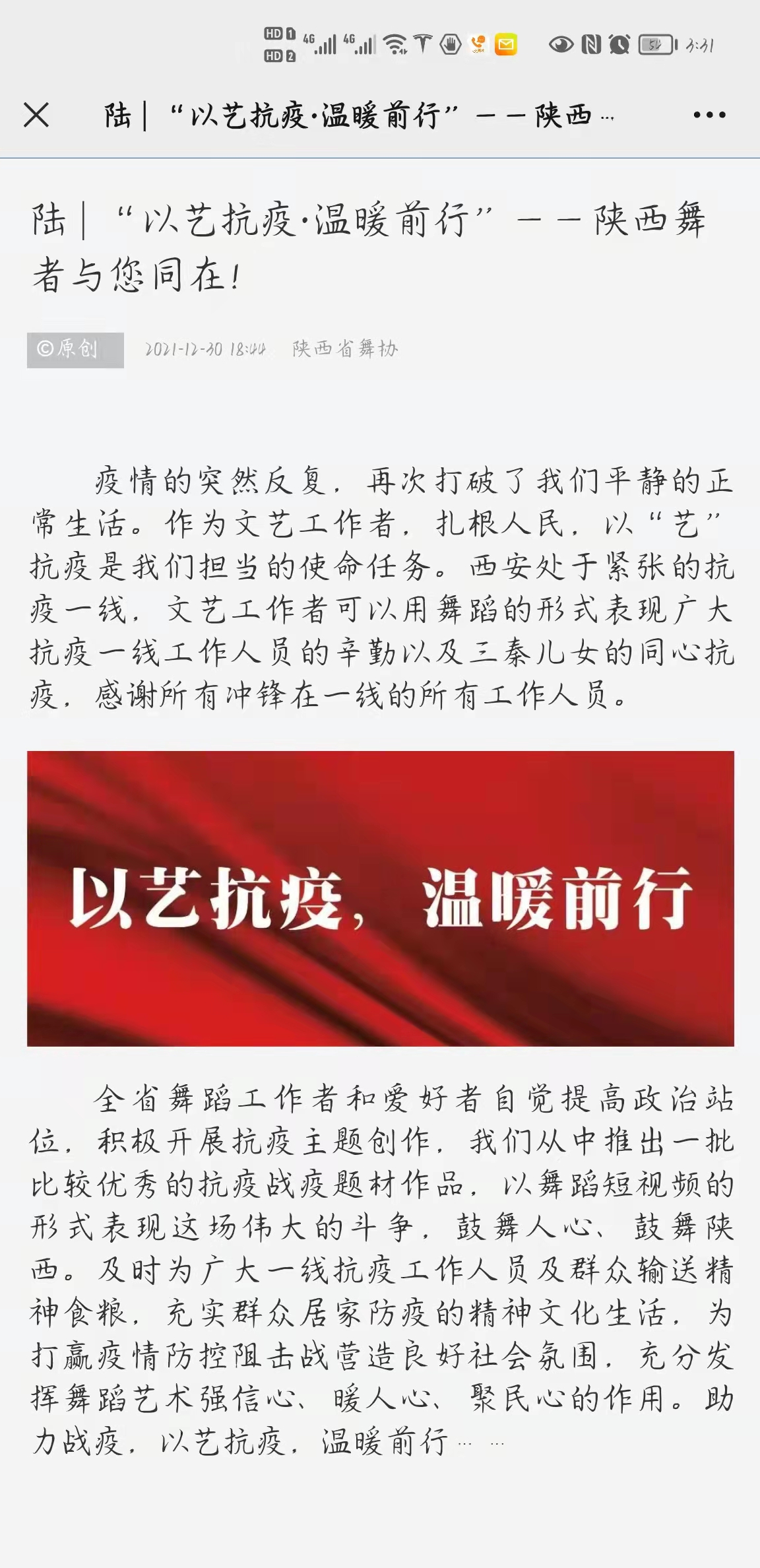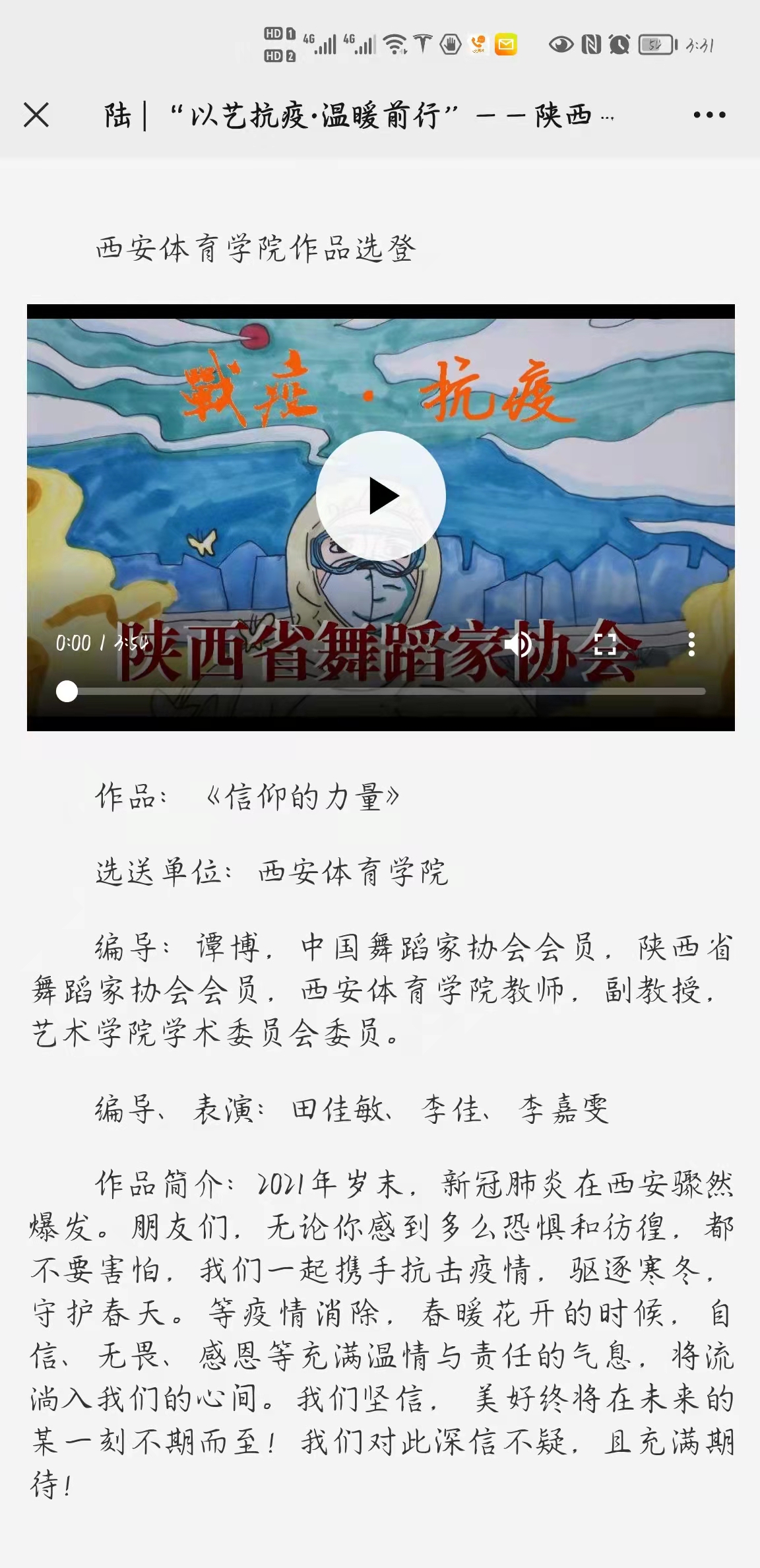 2021年12月29日由万象城allwincity官网艺术学院舞蹈教研室报送的舞蹈作品《信仰的力量》在陕西省舞蹈家协会举办的“以艺抗疫,温暖前行”—陕西舞者与您同在!的活动中被刊登入选。此作品由谭博老师指导,由19级舞学一班石佳敏 李佳 李嘉雯三名同学进行创编。舞蹈以抗战疫情为创作背景呼吁大家无论感到多么的恐惧和彷徨不要害怕。我们会一起携手抗击疫情,等待疫情结束春暖花开的时候,希望将流淌入我们的心间美好终将到来。