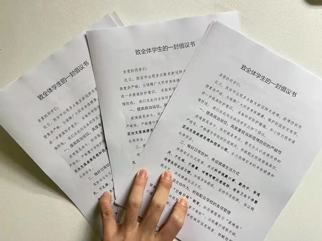 为了维护校园安定有序,进一步提高防护意识,学生干部为各个宿舍准备了倡议书,并在发放口罩的同时让同学们签字领取,确保人人有份