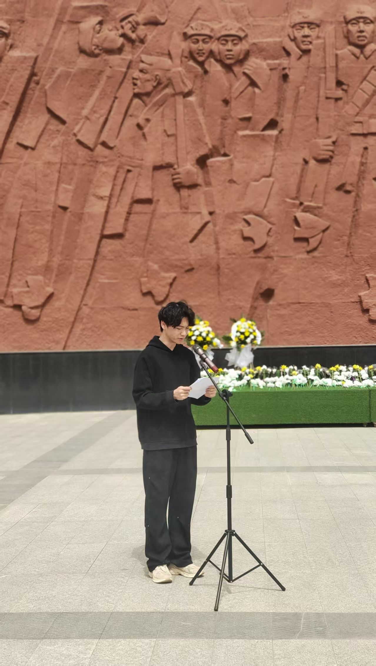 微风轻拂,活动在主持人张靖敏同志的引导下正式拉开帷幕。敬献花篮环节,毛娟、刘思雨两位同志手捧花篮,迈着庄重步伐走向革命烈士纪念碑。洁白花朵象征着烈士纯洁高尚的品格,鲜艳缎带承载着他们的不朽功绩,也寄托着师生们的无限敬意。敬献花篮后,全体师生默哀一分钟,脑海中浮现出先烈们在硝烟战场为国家独立和民族解放冲锋陷阵、抛头颅洒热血的英勇场景。