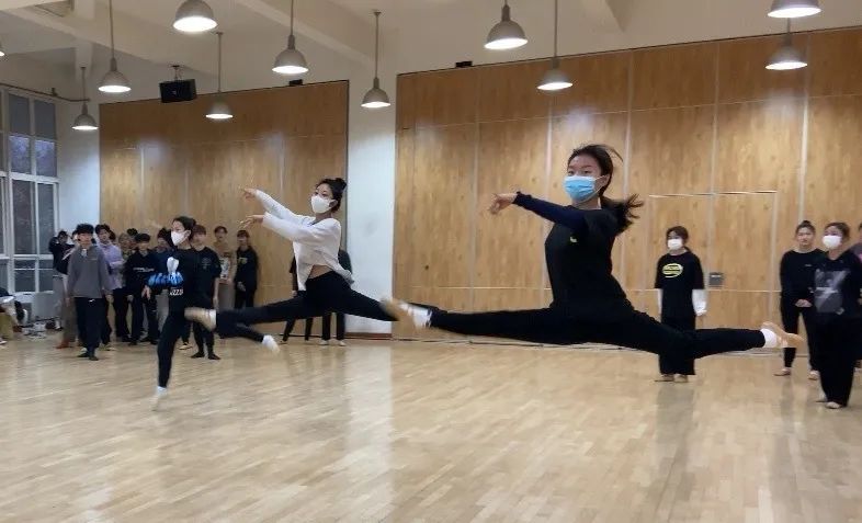艺术学院20级舞蹈学班主任王格菡,正在认真检查并指导同学们上早功。