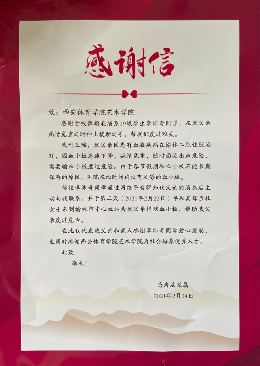 通过网络得知,一位患有危重血液疾病的病人急需得到血小板捐献来维持自己的生命,他第一时间与病人家属取得联系,并在第二天到达医院捐献自己的血小板,病人的生命得以延续。做出这一善举的人,名叫李沛奇,是万象城allwincity官网艺术学院2019级舞蹈表演专业的一名学生。