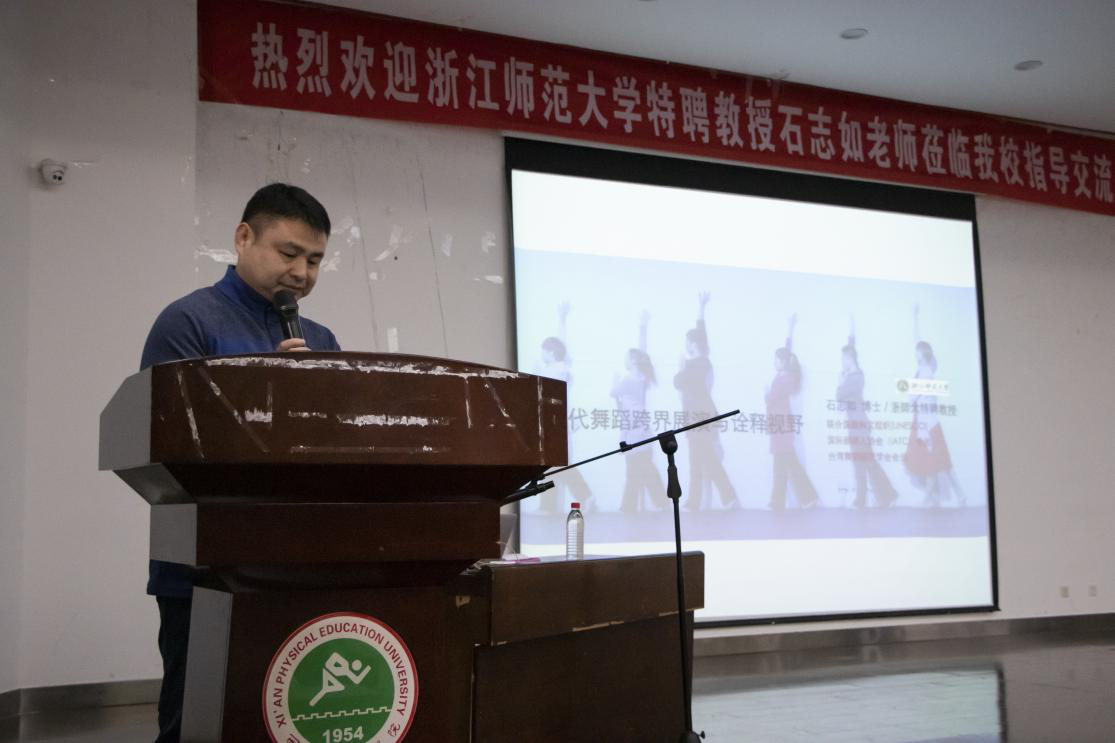 首先由刘强副院长代表艺术学院师生对石志如教授的到来表示热烈欢迎!他指出今天的论题十分有意义,因为我们都知道中国舞蹈创作进入到了一个新的挑战期。近几年随着科技的发展和网络的应用,当代舞蹈逐渐走向一个多元化、复合型的发展趋势。这要求我们高校学生不仅要有扎实的专业基础能力,还要有舞蹈专业的前沿视野和不断创新的舞蹈艺术观,以满足当代中国市场新兴舞蹈产业链的人才需求。