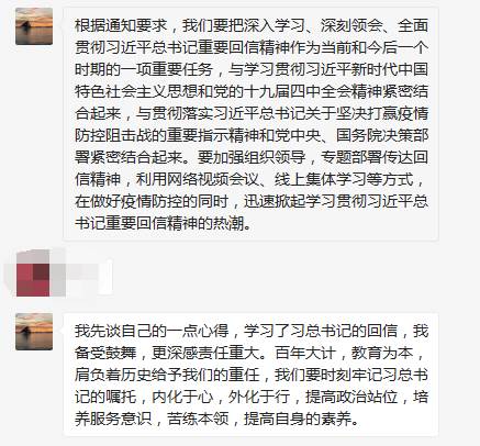 2020年3月30日网络管理中心通过微信平台开展了对习近平总书记给在首钢医院实习的西藏大学医学院学生重要回信精神的学习,并进行了讨论发言。学习讨论会由党支部书记王爽主持。