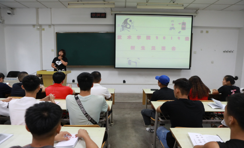 2019年9月2日,武术学院2019级新生见面会在教学楼103教室正式召开。本次见面会由19级年级主任王华老师主持,出席本次见面会的有党总支书记朱舰、主任马文国,武术套路、散打、重竞技各教研室主任及支部书记,系办、各年级辅导员以及2019级的全体新生。