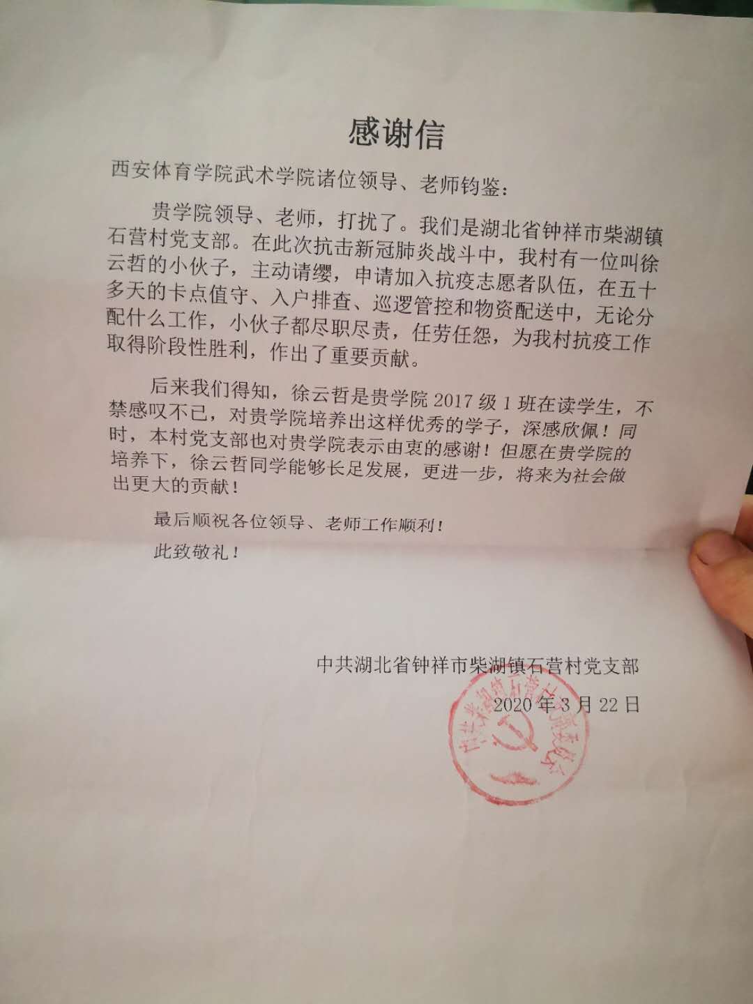 徐云哲是万象城allwincity官网武术学院2017级学生,家乡在湖北省钟祥市柴湖镇石营村,寒假返乡,原本打算和外出打工的父母在家团聚,不曾想1月24日以后,湖北省疫情防控日渐升级,在做好个人防护的同时,徐云哲主动请缨,申请加入村里的抗疫志愿者队伍,连续五十多天,坚持在卡点值守,和村干部一起挨家挨户排查、巡逻管控、物资配送。正如石营村党支部的工作人员在感谢信中所说:无论安排什么样的工作,小伙子总能尽职尽责的完成,感谢贵校培养出这样优秀的学子。