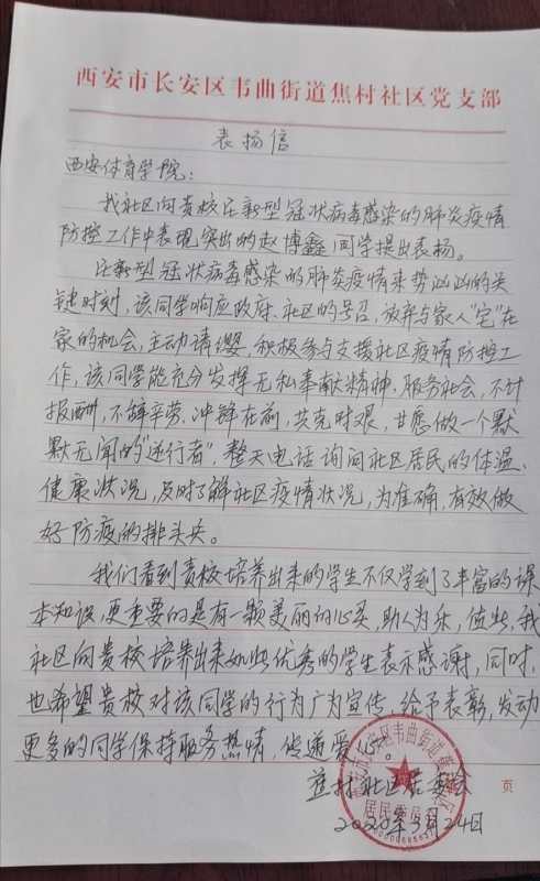 赵博鑫,武术学院大三学生,家住陕西省西安市长安区韦曲街道焦村社区,在疫情防控关键时刻,看到所在村委会同志积极地投入战斗,他主动报名参与社区疫情防控工作,每天电话询问社区居民的体温健康状况,及时了解社区疫情状况,为村民宣传讲解防疫知识,做好社区防疫工作的排头兵。“虽然不能像援鄂医疗队和湖北武汉医务工作者那样奋战在防疫第一线,但是作为一名体育生,为自己的乡亲们出点力气是应该的。”