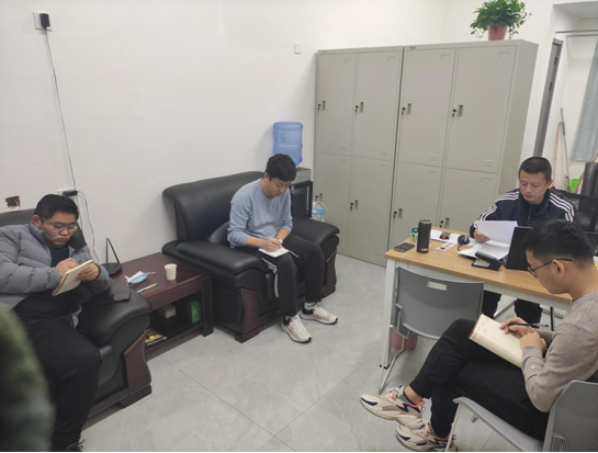 12月24日上午10:50武术学院在鄠邑校区2021级年级办公室召开辅导员工作会议,含光校区2019级辅导员兼年级主任王华、2018级辅导员李广玉采用线上,2020级辅导员贺去非、2021级辅导员智文飞、兼职辅导员王涛采用线下参加,会议由总支书记兼副院长朱舰主持。