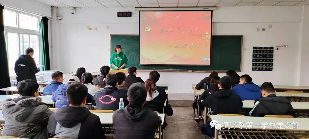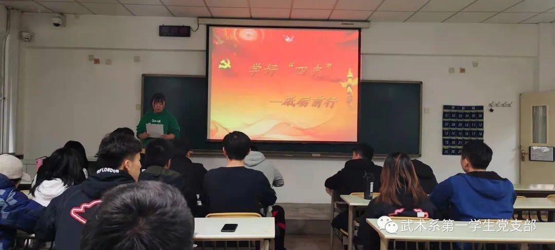 为深入学习贯彻落实习近平总书记关于党史、新中国史、改革开放史、社会主义发展史(以下简称“四史”)的重要指示精神,2020年12月10日,武术学院学生党支部在新教学楼405教室组织展开了有关“学好‘四史’,砥砺前行”的学习教育。