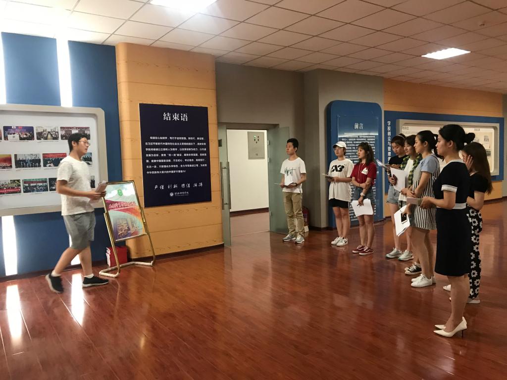 校史馆管理员顾彬老师带领大家参观校史馆,回顾了学院的创办历史和发展沿革,详细介绍了学院建校65年来在教学、科研、训练、竞赛、人才培养、校园文化、对外交流等方面的发展成果,并对校史馆的结构布局和硬件设施等进行了简要的介绍。随后,学生讲解员在校史馆逐一进行模拟试讲,两位老师针对每位同学的问题进行现场指导。
