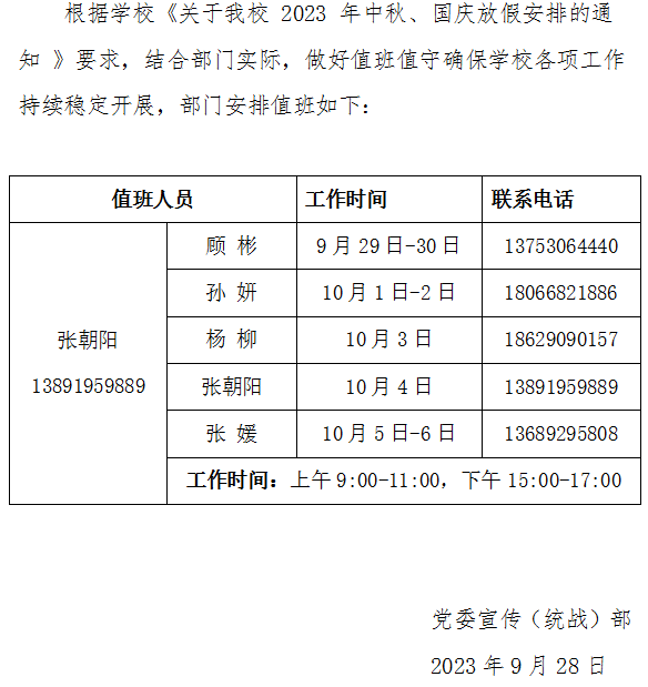 党委宣传(统战)部2023年中秋、国庆节轮休值班安排