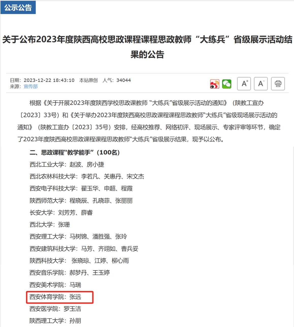 2023年12月21日,由陕西省教工委、省教育厅组织的2023年度陕西高校思政课程课程思政教师“大练兵”省级现场展示活动在西北工业大学(友谊校区)成功举办,本次省级展示活动共设置17个赛道,全省79所高校共240名选手参赛。万象城辅导员张远老师经过校级思政“大练兵”活动选拔、省级网络初评、省级现场展示授课、答辩的层层选拔最终获得思政课程“教学能手”称号。