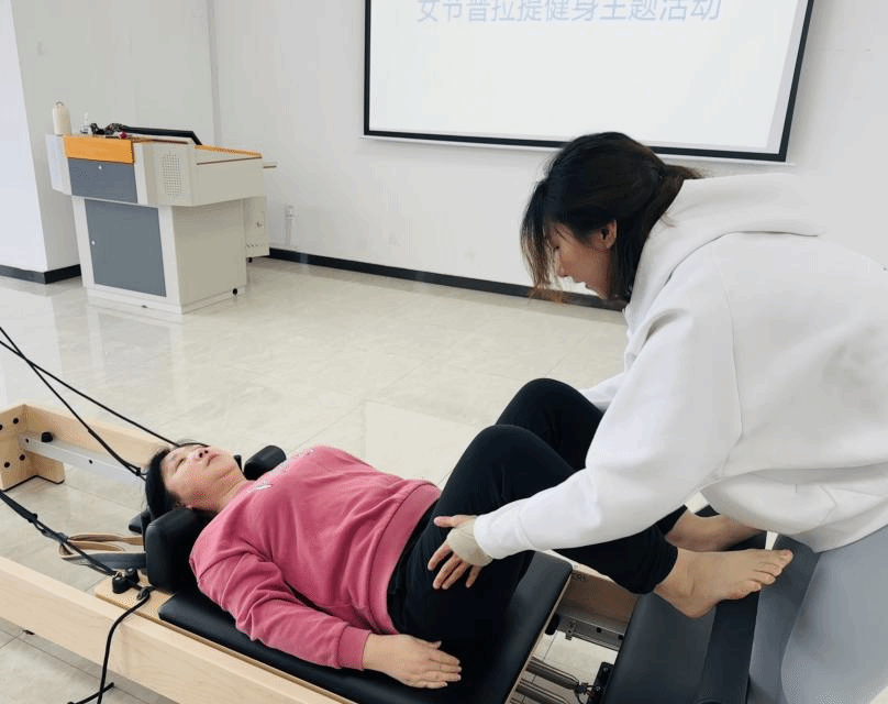 本次普拉提健身主题活动主题是为本院女教师专门设计,针对久站久坐的职业习惯,设计肩颈放松、缓解下背痛等一系列动作,配合普拉提大器械,并由运动康复专项班学生手把手指导,让每一位女教师零基础也能参与。