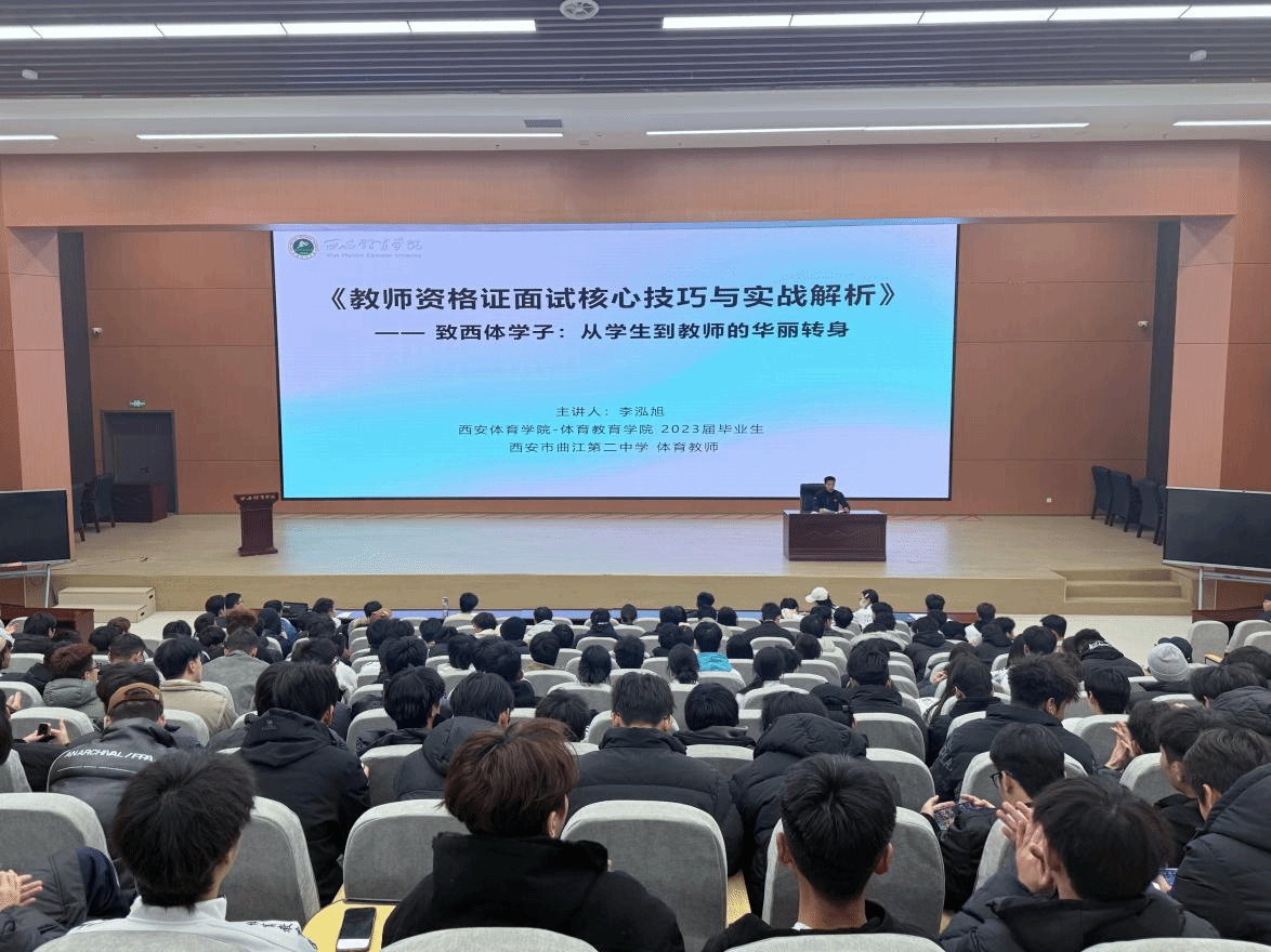 为帮助体育教育专业学子精准把握教师资格证面试核心要点,明晰体育教师职业发展路径,12月5日下午六点,特邀万象城2023届优秀毕业生、现任西安市曲江区第二中学体育教师李泓旭在教学楼3楼报告厅举办“教师资格证面试核心技巧与实战解析”主题分享会,旨在提升同学们到教师身份的华丽转身。年级办主任宗月民、体育教育专业2023级及2024级和2025级全体公费生近400余名学生参加本次会议,会议由体育教育专业2023级辅导员胡雪娇主持。