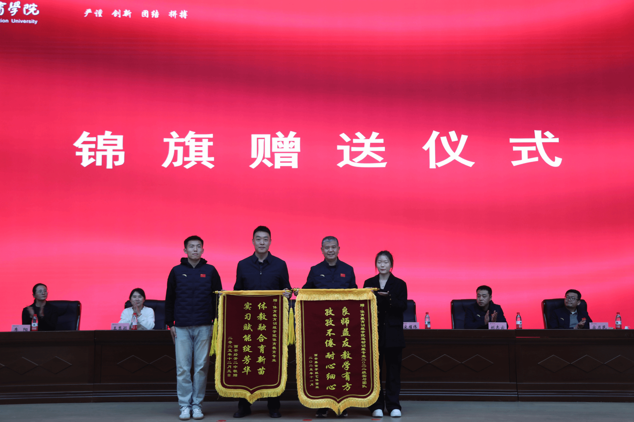颁奖仪式环节,宋耀伟为优秀实习生、优秀实习队及优秀实习队长颁奖,武洛生为优秀秀实习实践辅导员及优秀指导教师代表颁奖,现场掌声雷动,为获奖集体与个人送上祝贺。大会还举行了锦旗赠送仪式,宋耀伟、武洛生上台接受实习单位代表赠送的锦旗,锦旗上“体教融合育新苗,实习赋能绽芳华”的字样彰显了实习单位对学校教学实习工作的高度认可与衷心感谢,双方握手合影,定格下协作共赢的温暖瞬间,锦旗承载着师生对各方支持的感恩与对未来的期许。