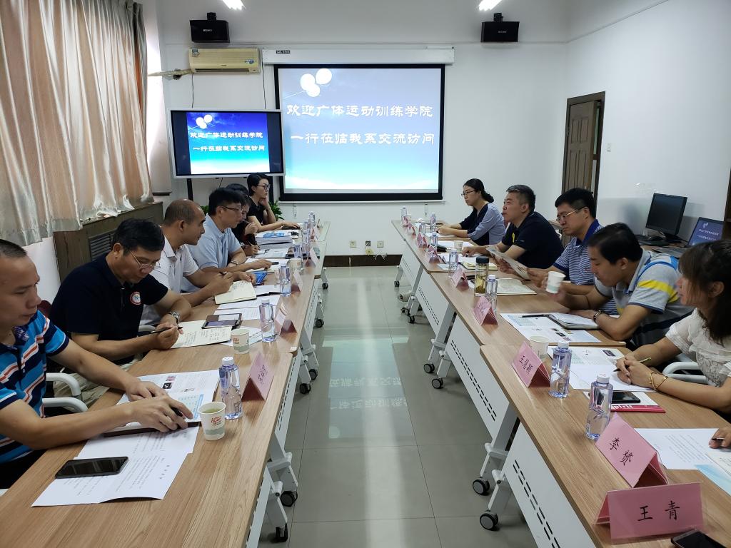 本网讯 9月14日上午,广州体育学院运动训练学院孙健院长一行来系交流座谈。运动训练系主任张葆欣、党总支书记张卫国、副主任武洛生出席,排球教研室主任、运动训练系各年级主任及办公室工作人员参加了本次活动。座谈会在运动训练系会议室举行。