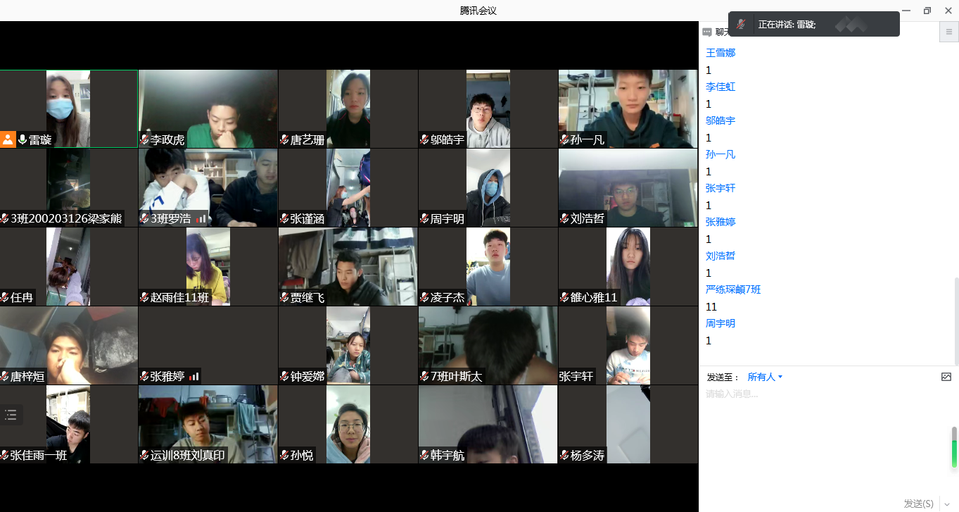 会上王青、雷璇指出:近期西安疫情形势严峻复杂,要求同学们加强个人防护,遵守校区疫情防控规定。并提出几点要求:一要积极配合校区进行核酸检测,坚持不漏一人原则,做到应检尽检,各班长要做好核酸检测人数统计工作;二、各班长、班委、入党积极分子要负起责任,做好表率,在疫情防控管理工作中要督促学生每日按时进行日检日报、校园定位打卡工作,要带头搞好宿舍卫生,营造良好的学习生活环境;三、疫情防控期间不信谣、不传谣、保持积极乐观的心态;四、如遇发烧、咳嗽等症状,及时上报;五、年级班会全力以赴配合校区做好学生工作,学生如遇身体、心理上的问题,可以随时联系年级办老师,老师全天24小时为学生提供帮助。