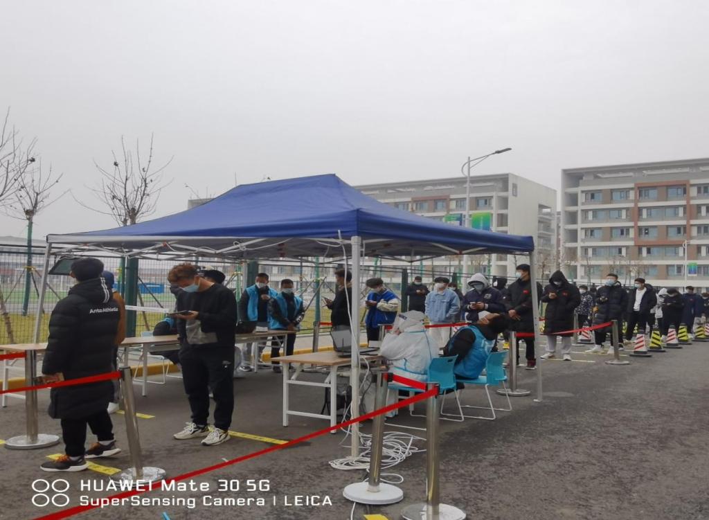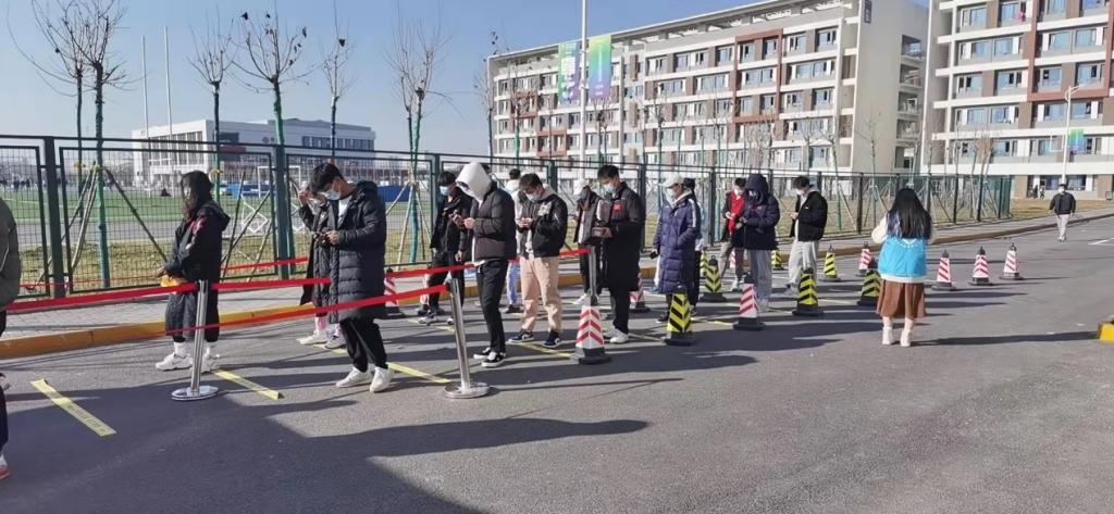 运动训练学院2021级辅导员王青、李森森带领学生干部、志愿者指挥学生做核酸检测工作