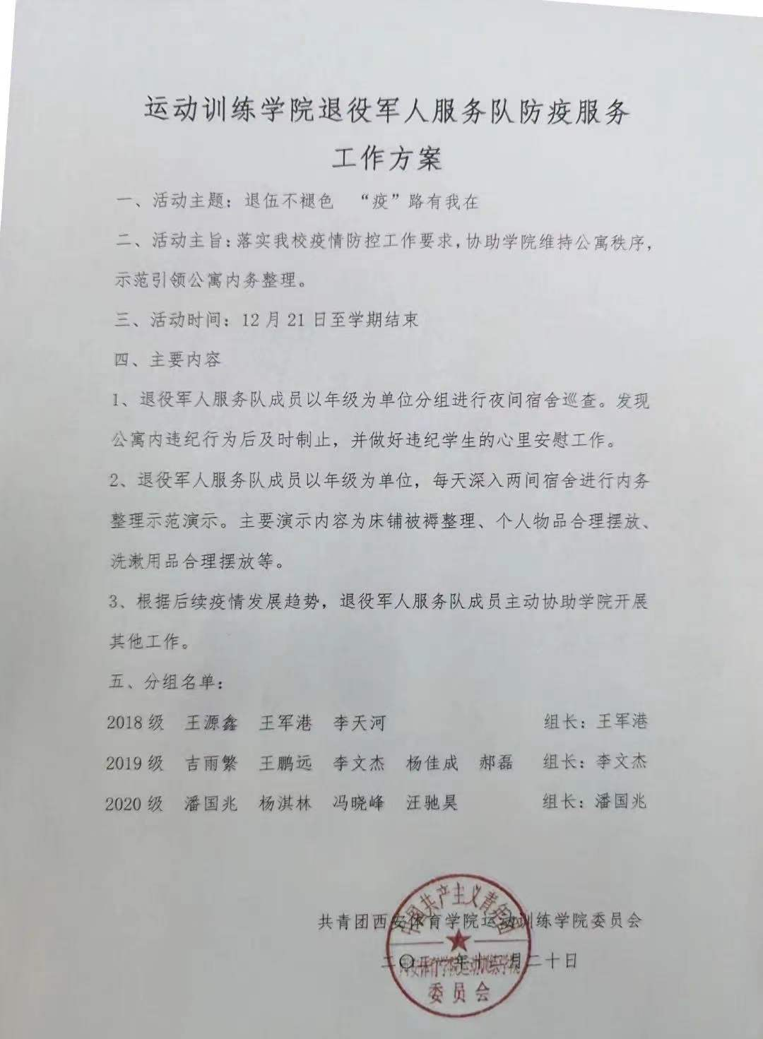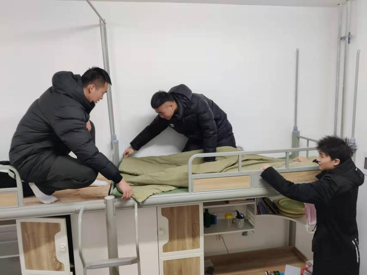 面对突如其来的疫情,为了落实万象城疫情防控工作要求,协助学院维持公寓秩序,示范引领公寓内务整理,运动训练学院还成立了以退伍复学学生为主体的退役军人志愿服务队。退役军人服务队每晚协助辅导员对宿舍环境卫生进行检查,指导学生宿舍的内务。