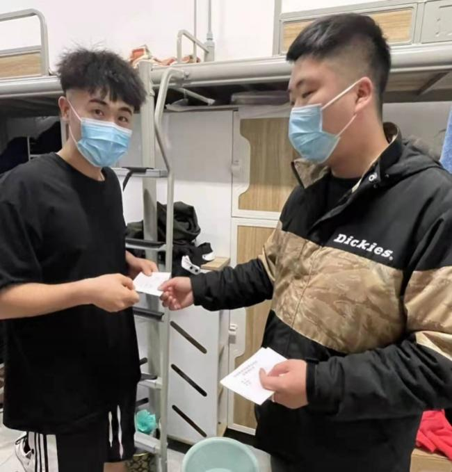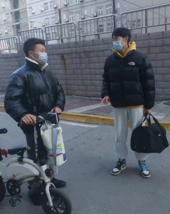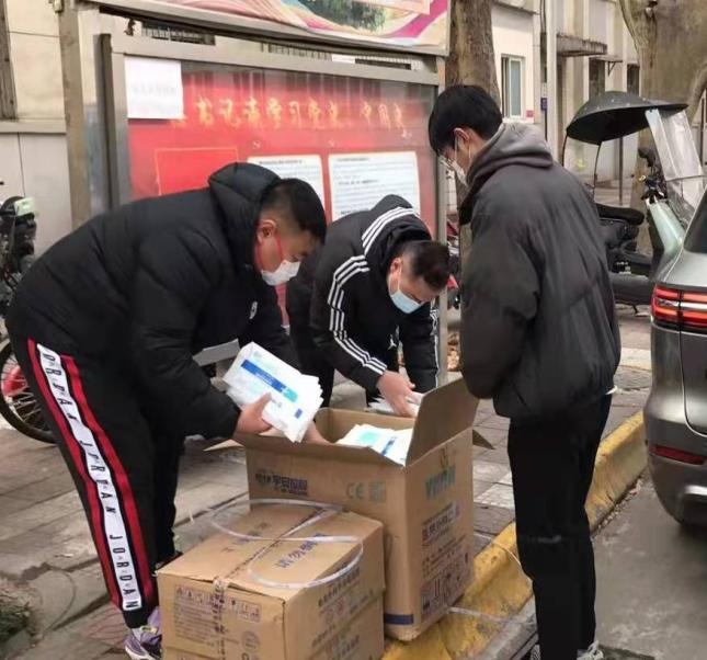 照片十:年级主任张即帅、兼职辅导员南海涛给学生搬运发放校友捐赠防疫物资,带领党员先锋队维持核酸检测秩序