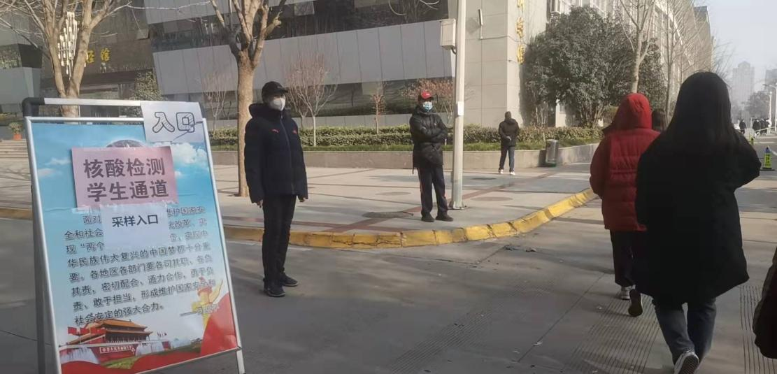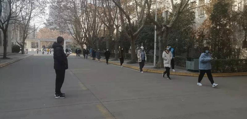 核酸检测,组织有序。在全员核酸检测时,辅导员老师们有序组织学生依次按楼宇、楼层、年级、宿舍安全、快速“间隔一米”排队往返。在核酸检测的沿途,学院领导干部、教授、教研室主任、支部书记及党员,巡查排队和间隔情况,为学生安全、有序检测保驾护航。
