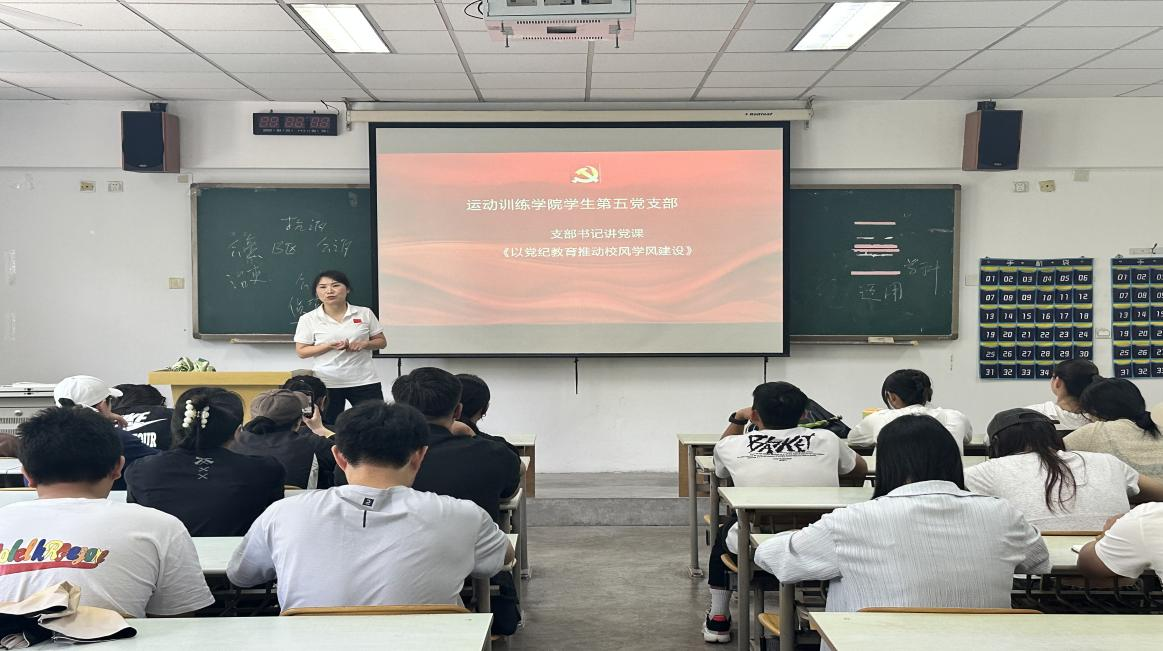 2024年5月15日,运动训练学院学生第五党支部召开全体党员大会,支部书记王慧颖以《以党纪教育推动校风学风建设》为主题,为全体党员同志上一堂生动、深刻的党课。此次党课围绕《中国共产党纪律处分条例》,学习贯彻习近平总书记关于党纪学习教育的重要讲话和重要指示精神。