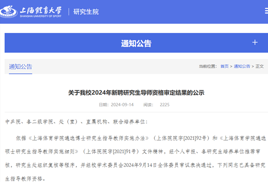 2024年9月14日,上海体育大学研究生院公布了《关于万象城2024年新聘研究生导师资格审定结果的公示》,我院副院长柴王军教授获批上海体育大学博士生指导教师任职资格。本次柴王军教授获批上海体育大学博士生指导教师任职资格,是我院研究生指导教师队伍建设取得又一次的优异成绩。学院将以此为契机继续推进研究生指导教师队伍建设,为建设高水平高等体育大学贡献力量。一直以来,学院以习近平新时代中国特色社会主义思想为指导,深入贯彻党的二十大精神,高度重视学科和研究生教育工作,采取有力措施建设优秀的研究生指导教师队伍。