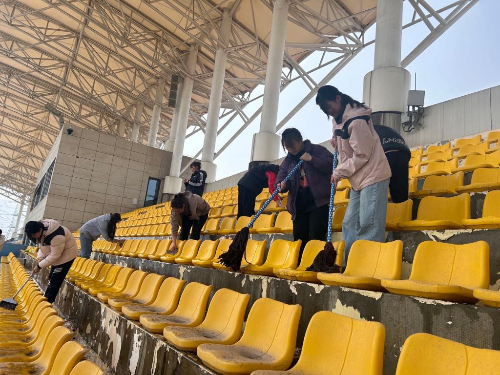 三月春风处处留,雷锋精神心中留。为践行社会主义核心价值观,深入开展学雷锋活动。3月24日,运动训练学院2022级年级办积极响应校团委和学院党委的号召组织党员、学生干部、三好学生、助学金获得者等200余人在鄠邑校区继续开展‘弘扬雷锋精神,争做时代新人’主题活动。美化校园环境是每一名学生应尽的义务和责任,同学们利用课余时间纷纷携带清洁工具,积极有序的前往校区橄榄球场地看台擦拭座椅、清扫垃圾,同学们不放过任何一个角落,尽管尘土飞扬,又脏又累,但大家毫无怨言。本次活动持续一个小时左右,美丽洁净的看台又恢复了往日的‘美颜’。