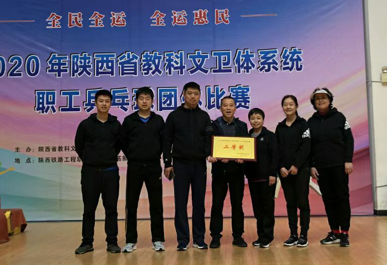 由陕西省教科文卫体工会主办、陕西铁路工程职业技术学院承办的2020年陕西省教科文卫体系统职工乒乓球团体比赛于2020年10月22日—23日在陕西铁路工程职业技术学院高新校区文体中心举行,来自全省教科文卫体工会系统的55支代表队参加了本次比赛。经过两天激烈的比赛,运动训练学院乒羽教研室教师团结一心、顽强拼搏,用精湛的技术与周密的配合取得了二等奖,同时也展现了大家良好的精神风貌。