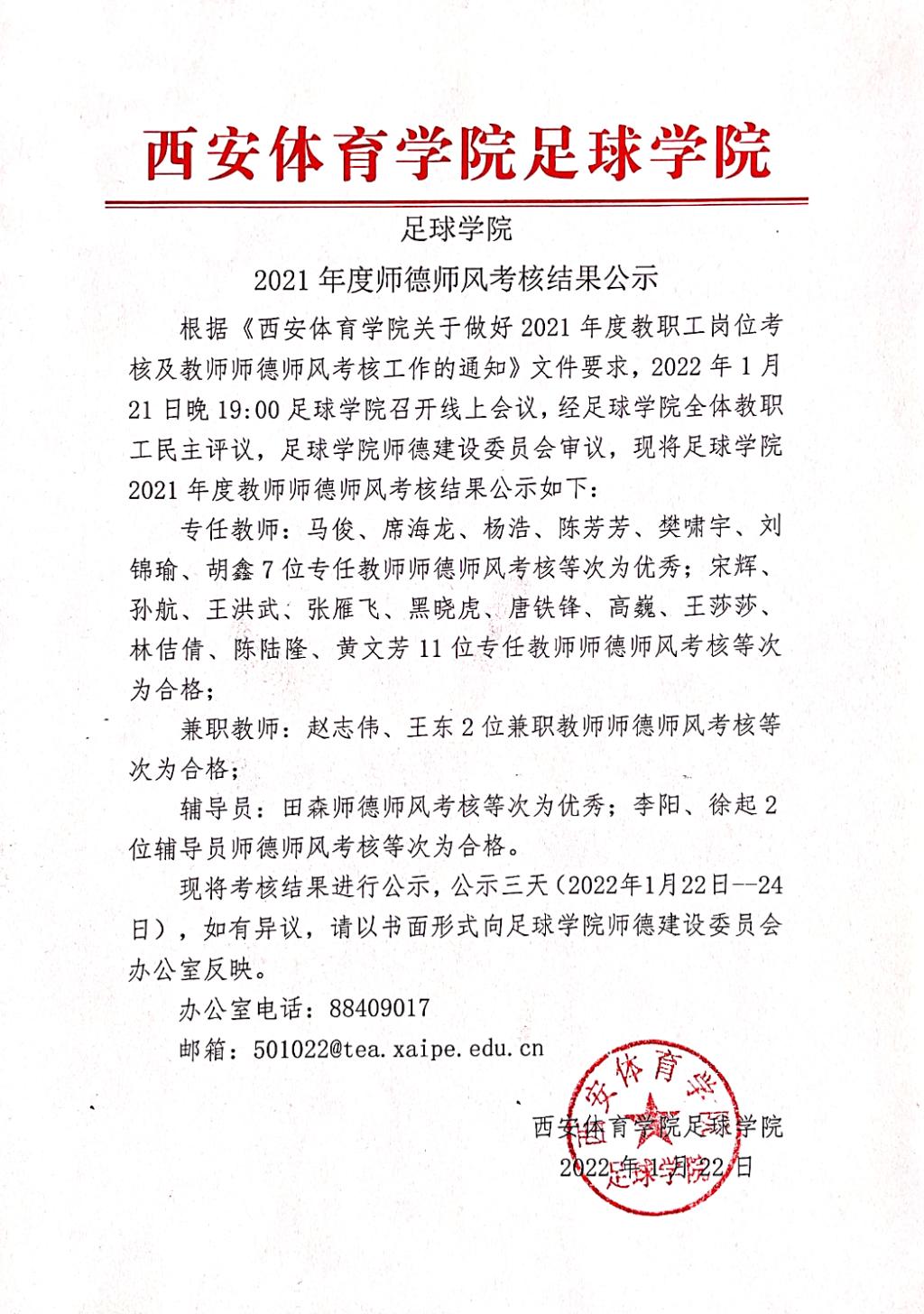 足球学院2021年度师德师风考核结果公示