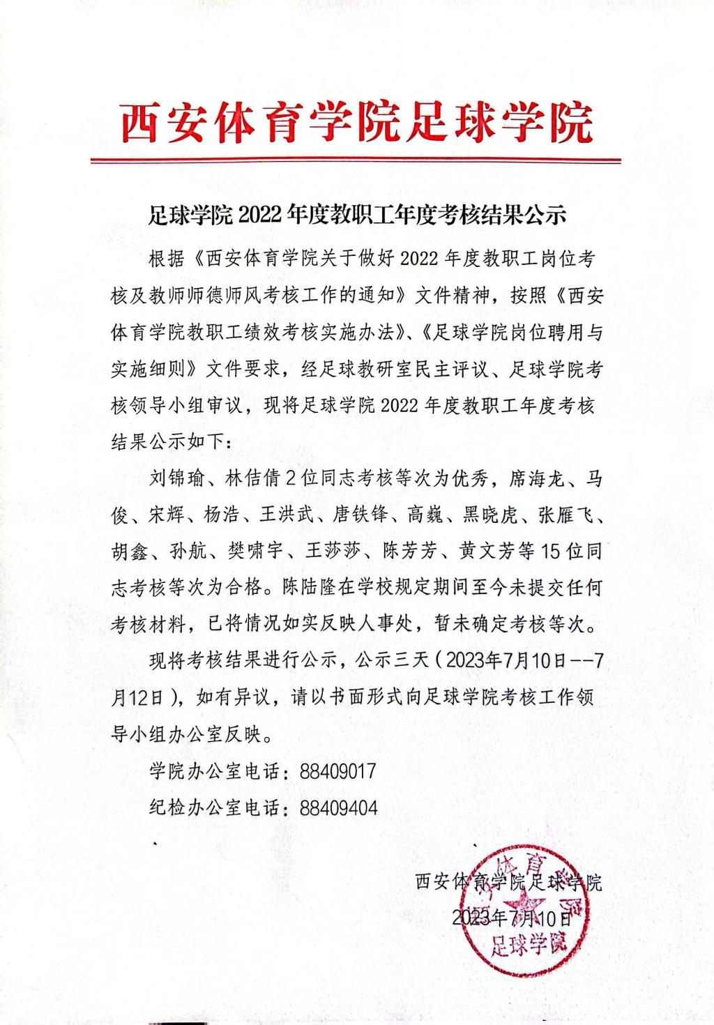 足球学院2022年度教职工年度考核结果公示