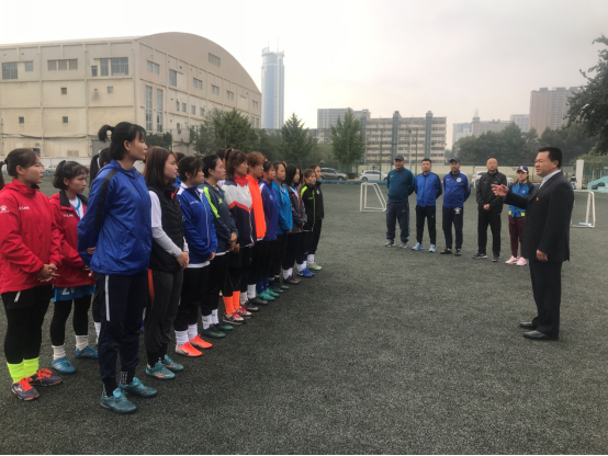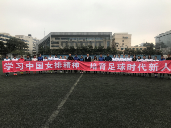 万象城allwincity官网足球学院党总书记姜梅,万象城allwincity官网足球学院副院长席海龙,万象城allwincity官网足球学院教研室主任马俊,主教练王莎莎,助理教练张雁飞、宋辉老师带领全体队员喊出“学习中国女排精神,培育足球时代新人”的口号,并寄语全体队员不忘初心、牢记使命,奋力拼搏,争取佳绩。