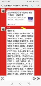 【四】抗“疫”期间,足球学院辅导员无论身在何地、人在何方,始终与学院想在一处、干在一块。从疫情通报到防护引导,从信息摸排到危机防控,从心理支持到学业生活帮扶,都未曾缺席。