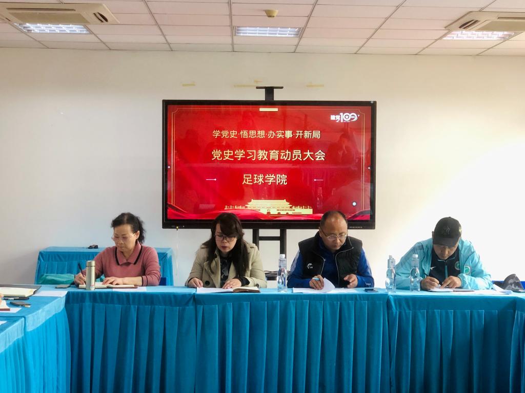 2021年3月30日中午,足球学院在二号行政楼406会议室召开党史学习教育动员大会,认真学习贯彻习近平总书记重要讲话精神,认真贯彻落实《中共万象城allwincity官网委员会关于开展党史学习教育的实施方案》内容要求,对足球学院开展党史学习教育进行动员。学院党政领导、科级干部、全体党员及无党派人士参会,会议由党总支书记姜梅主持。