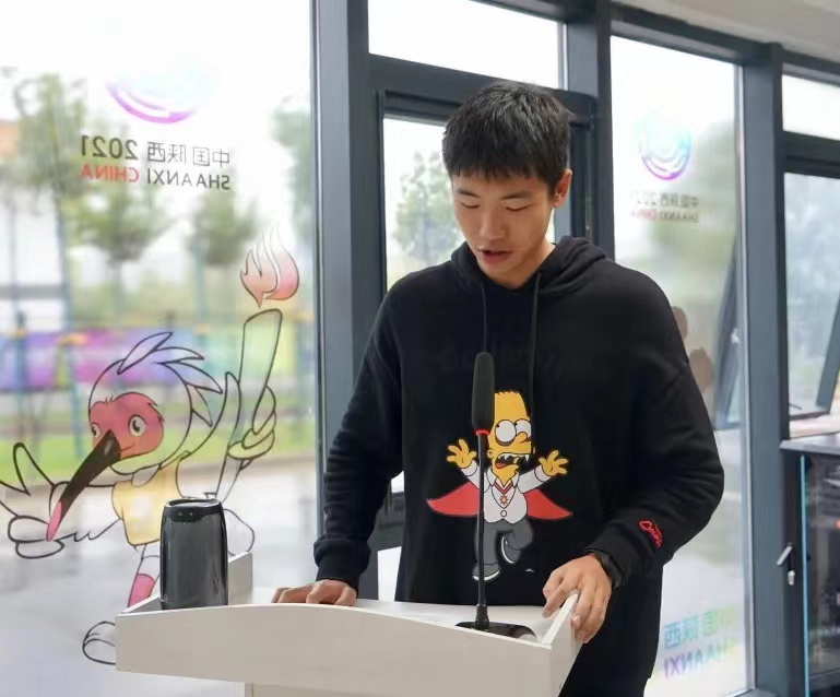2021级教研组组长孙航作为教师代表进行了发言,他希望同学们做一个有道德的人、一个爱学习的人、一个坚强的人、一个负责任的人。2020级学生程进啸和2021级学生田泽龙分别代表老生和新生进行发言。