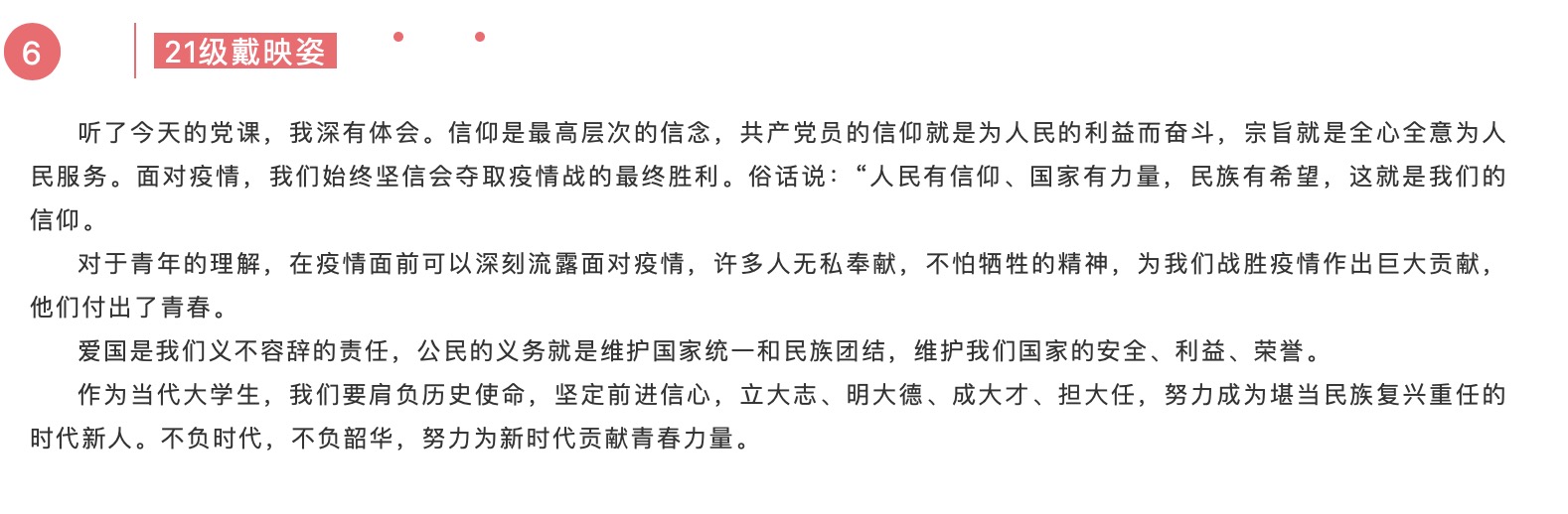最后,姜梅讲述了2则小故事谈到爱国情怀。在中华民族几千年绵延发展的历史长河中,爱国主义始终是把中华民族团结在一起的精神力量,激励着一代又一代中华儿女为祖国发展繁荣而不懈奋斗。此番疫情,将我们紧紧团结凝聚在一起,共同战疫,更深层次的彰显了“公而忘私,国而忘家”的爱国主义精神。