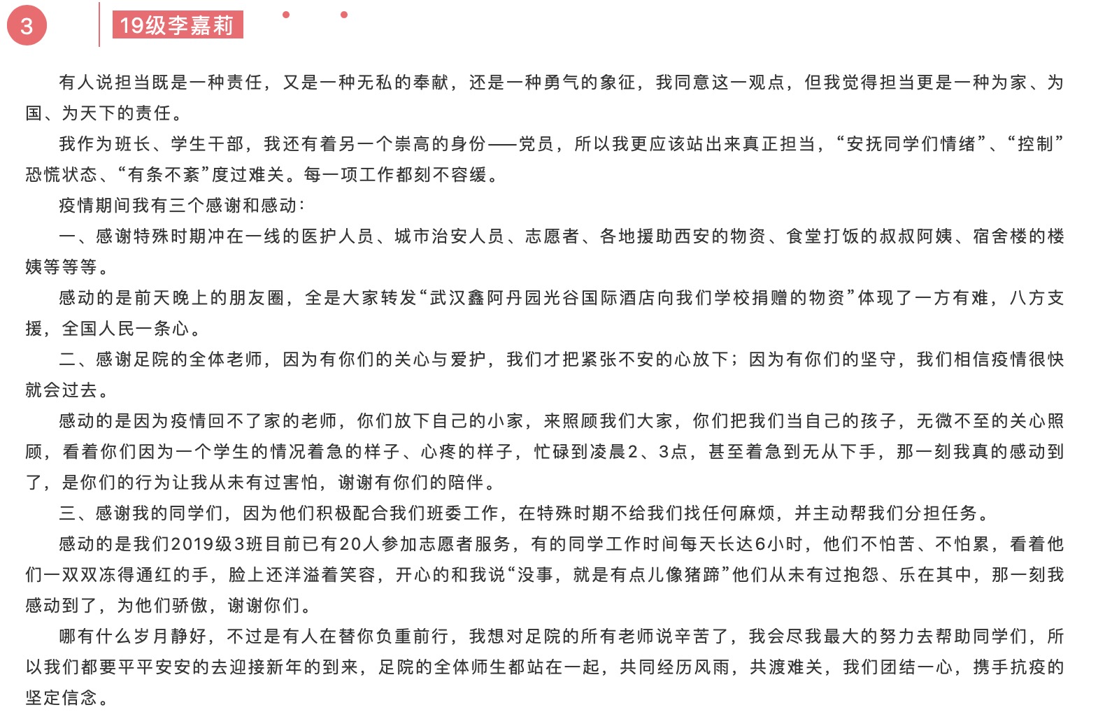 2021年与2022年之交的西安因为新冠疫情的突袭而变得不平凡,足球学院充分发挥网络优势,利用线上平台,全员行动、全过程行动、全方位行动,将此次疫情当成重要教材,把“三全育人”理念贯穿于整体工作,开展了线上系列“战疫”课堂,带给师生有温度的力量。