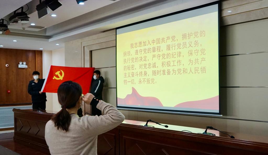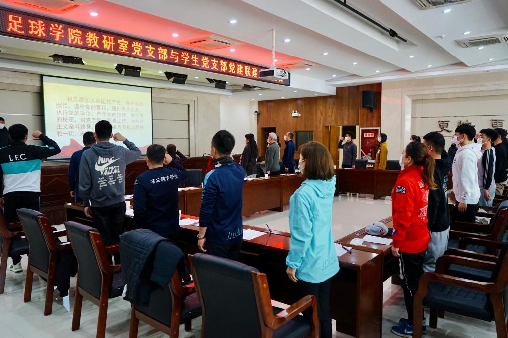 首先,由学生党支部书记李阳带领足球学院预备党员进行入党宣誓,老党员重温入党誓词。