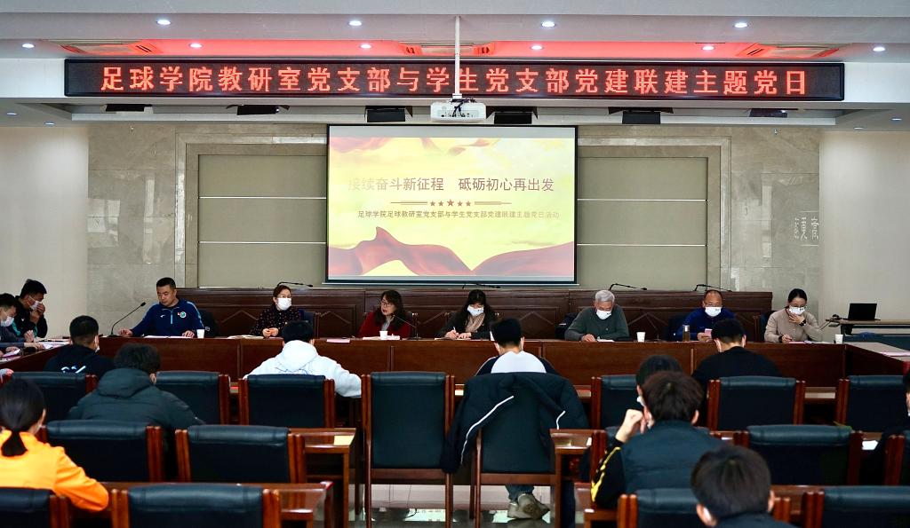 为进一步加强基层党组织合作与交流、增强党支部的活力,形成共建促党建、党建促发展的良性机制,11月17日下午,足球学院教师党支部与学生党支部在二号行政楼六楼报告厅开展了党建联建主题党日活动。足球学院教师党支部全体党员、足球学院学生党支部全体党员、入党积极分子、无党派人士参加,足球学院党总支书记姜梅、足球学院院长席海龙参加,校党委副书记、纪委书记赵军以普通党员身份参加,会议由足球学院教师党支部书记宋辉主持。