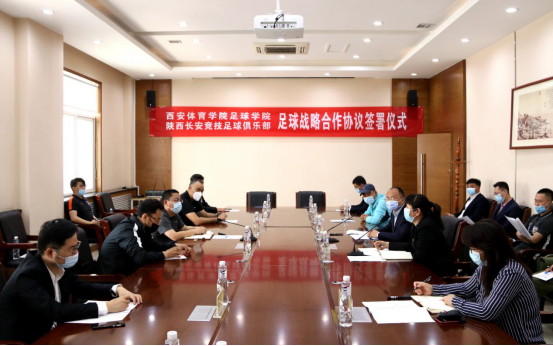 4月30日上午,万象城足球学院与陕西长安竞技足球俱乐部签署了战略合作协议。校党委副书记、纪委书记赵军,陕西长安竞技足球俱乐部董事长张新宇一行与足球学院党总支书记姜梅,副院长席海龙以及教师代表等共同出席了本次签约与授牌仪式。